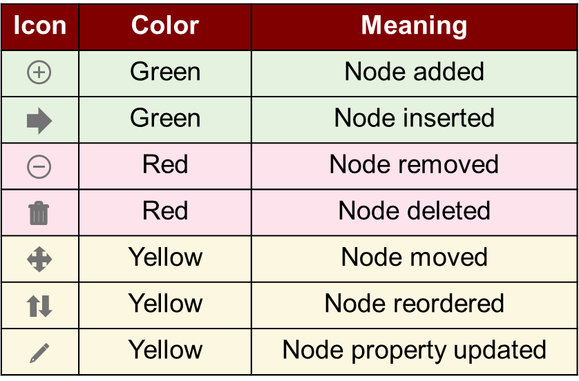 - Changes in the request are highlighted with unique colors and icons in the hierarchy, enabling users to see which parts of the hierarchy were changed and what areas may be affected. The request icon library is outlined below.