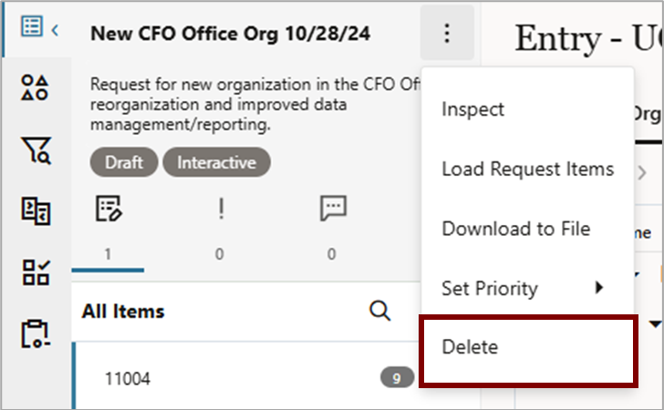 - Delete: Rejects the request. Use this option if the requested change is duplicated or not needed in the system. To delete the request, select the Vertical Ellipsis icon to the right of the Request Title and choose Delete.