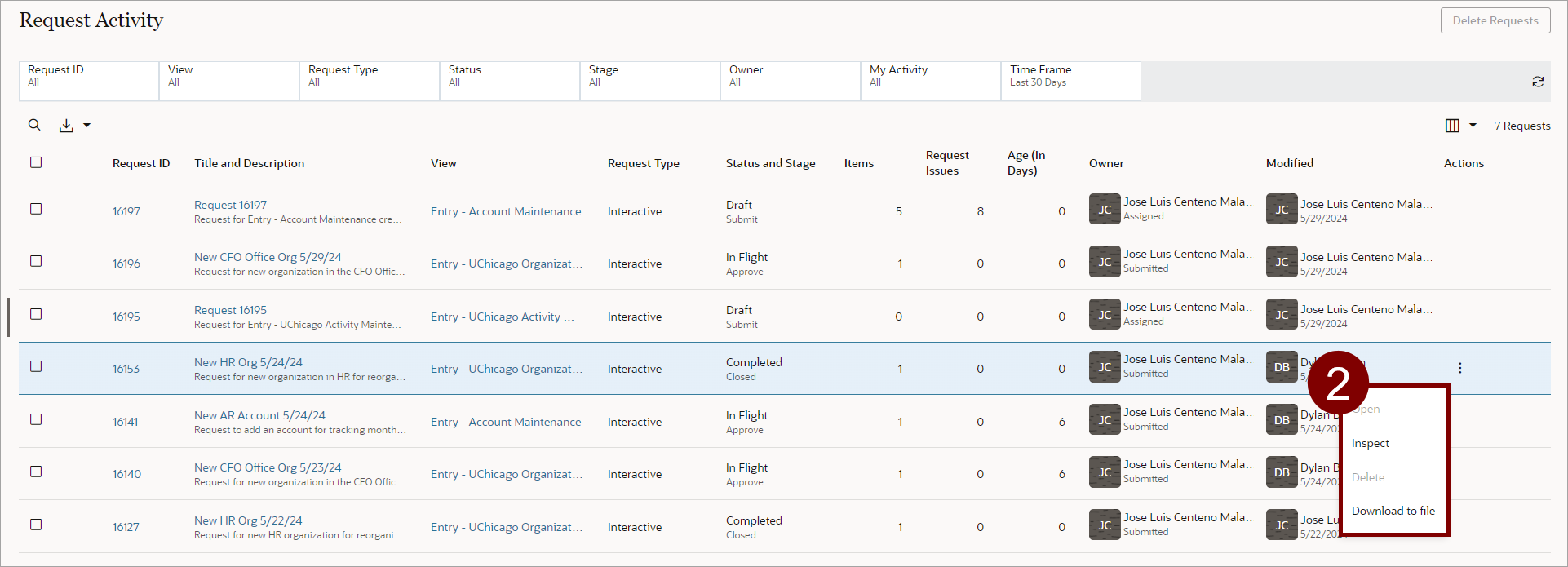 - From the list of requests on the Request Activity screen, use the Vertical Ellipsis icon under the Actions column and select Inspect to review details and transaction history for a specific request.