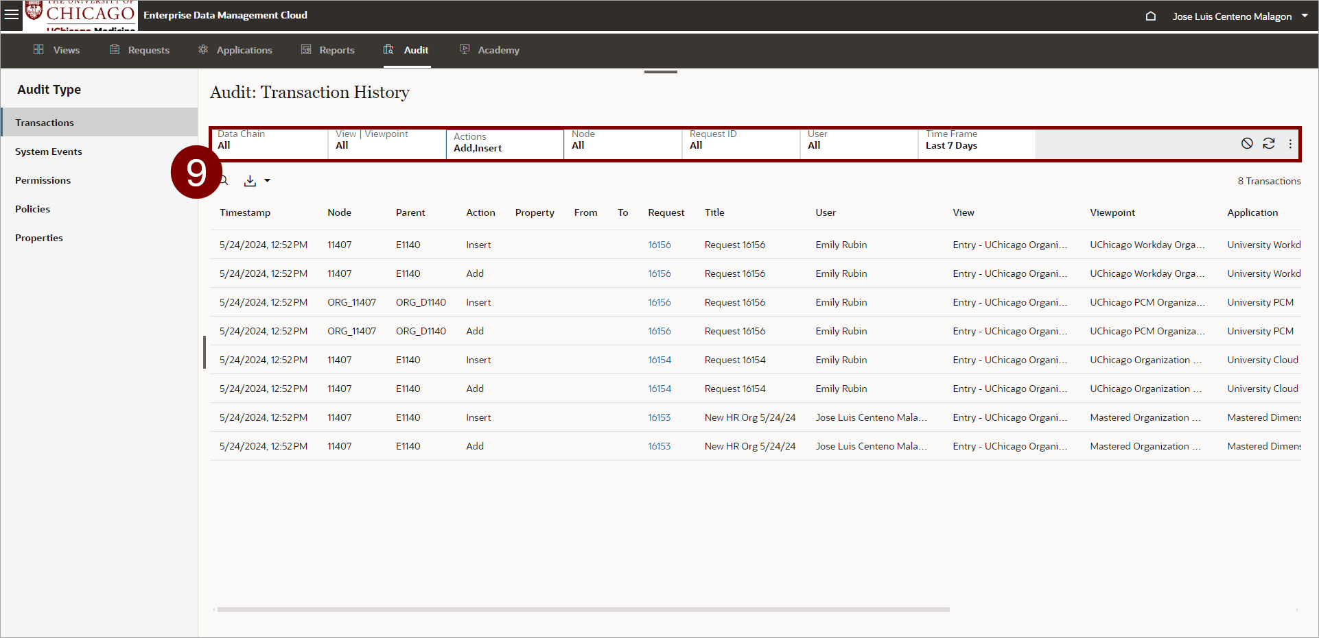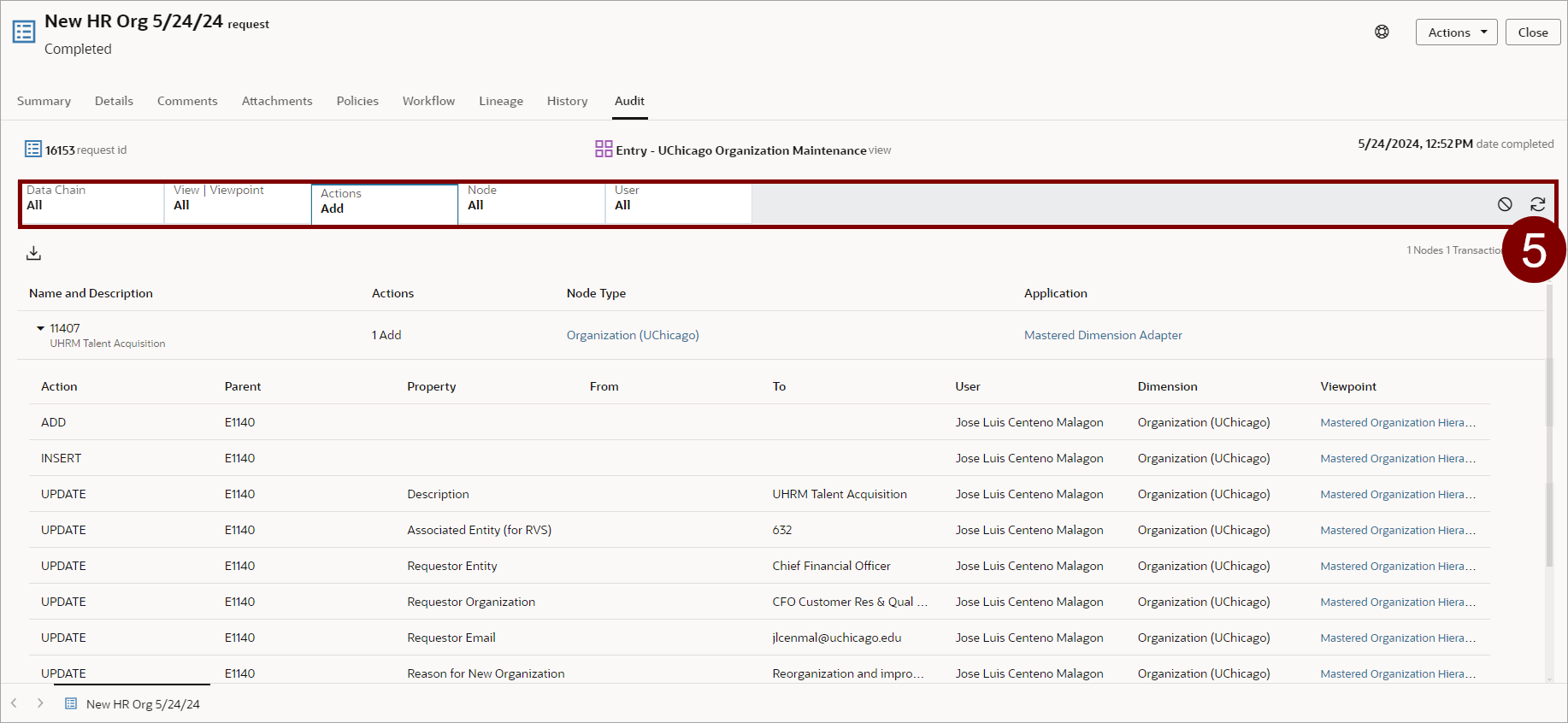 - Filter the items in the request using available parameters such as Data Chain, Viewpoint, Actions, Node, and User. Select the Reset icon to return all filters to their default values and the Refresh icon to update the data based on the current filter settings.