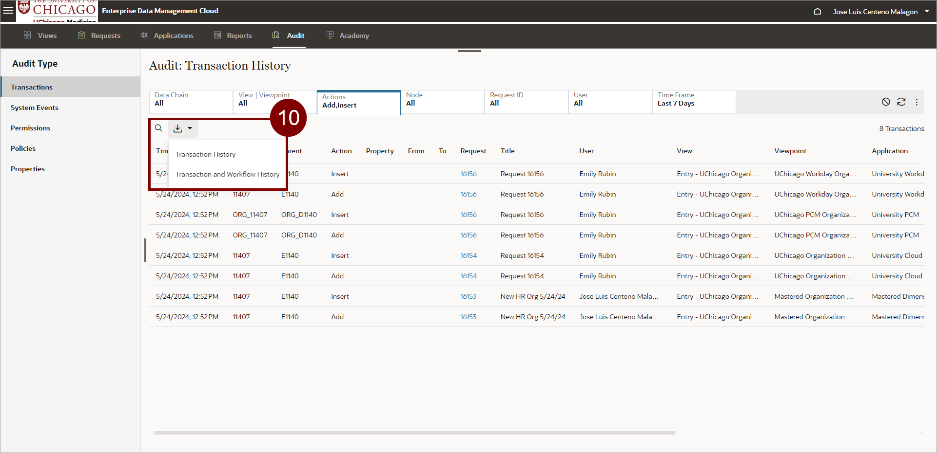- The Transactions tab displays changes made to data over time. NOTE: The transactions users can view depend on their application role and security permissions.