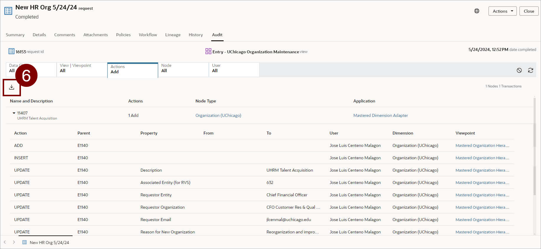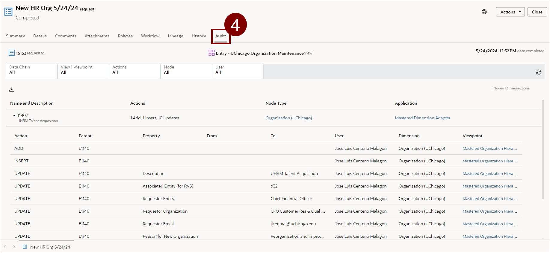 - Select the Audit tab to find a list of items that were included in the request. Expand each item to view a detailed list of all the actions taken on that specific node, including its parent node, the updates made to properties, the user who made the edits, the dimension, and the viewpoint. NOTE: This tab will only display information for Completed requests.