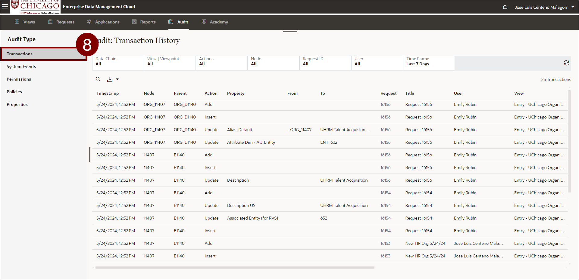 This guide is intended for UChicago business users who need to learn how to approve, reject, or push back requests for master data changes, as well as how to audit and track changes to enterprise data in the Oracle Enterprise Data Management (EDM) application.