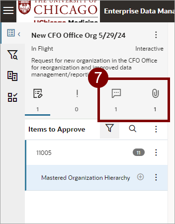 - After reviewing the request, add or reply to Comments, and review or add Attachments if desired. NOTE: To add or reply to a comment, select the Speech Bubble icon. To review or add an attachment, select the Paperclip icon.