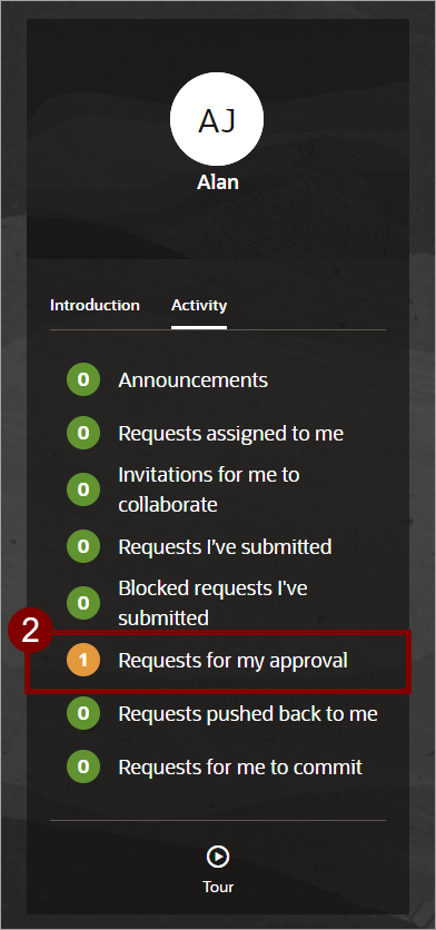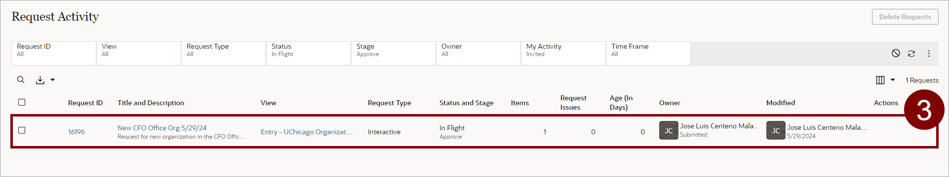 - From the list of requests on the Request Activity screen, locate the specific request that needs approval, and select either the Request ID or the Title and Description to open it.