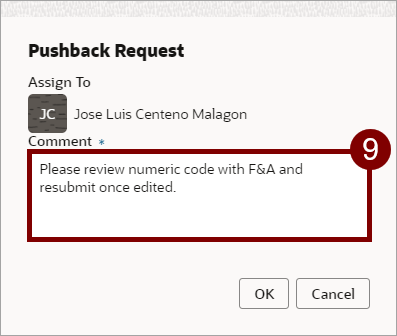 - When making a decision on the request, users will be prompted to enter a Comment. NOTE: This comment is OPTIONAL when approving the request but REQUIRED when pushing it back or rejecting it, as a reason must be provided for these actions.