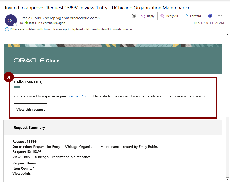 - NOTE: Users can also access an individual request directly from the email they receive when a request requiring their approval is submitted. From the email, select either the Request ID or the View this request button to open it.