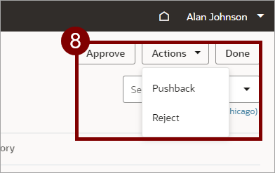 - For first-level approval as an Entity Financial Manager for updates to the Organization, Program, Site, Activity, and Fund (C90000 - Agency Funds and D27250 - Designated Operating) segments, proceed to Step 10.To make a decision on the request, select the appropriate option. Approve the request by selecting the Approve button located on the top right side of the screen. Push It Back to the submitter or Reject it by choosing the corresponding options from the Actions button. NOTE: If not ready to make a determination, select the Done button to keep the request in the In Flight status until an action is taken on it. Updates included in a request cannot be parsed out during approvals—all items in the request must be approved, pushed back or rejected together. Take this into consideration when making a decision.