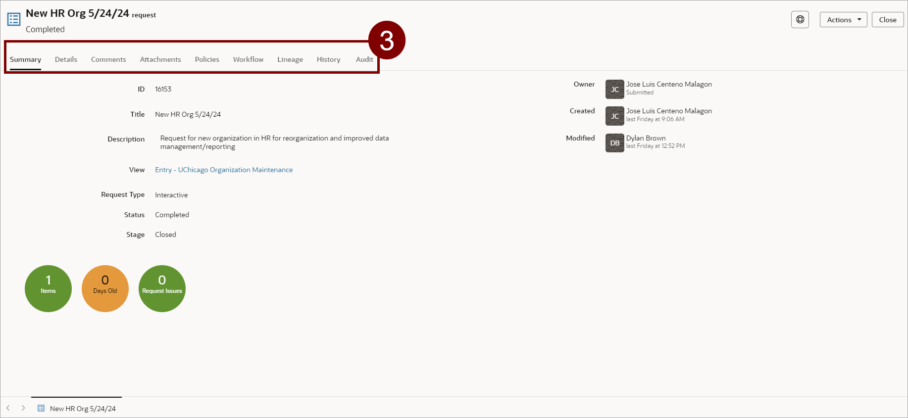 - A pop-up detail page about the request opens with tabs for Summary, Details, Comments, Attachments, Workflow, Lineage, History, and Audit. Please refer to our Enterprise Data Management (EDM) Fundamentals Knowledge Base article for details about these tabs.